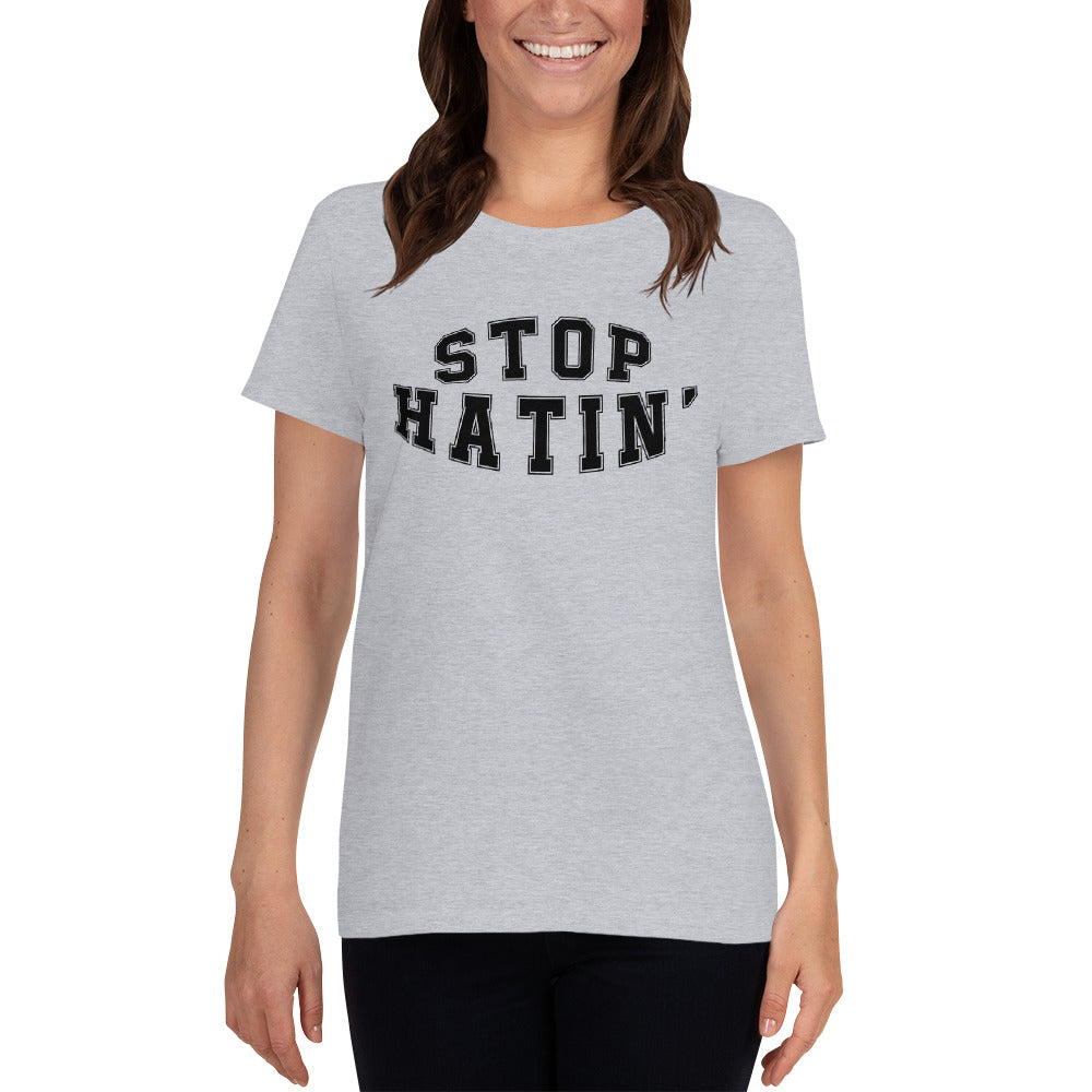 A heavy cotton, classic fit ladies scoop neck t-shirt.